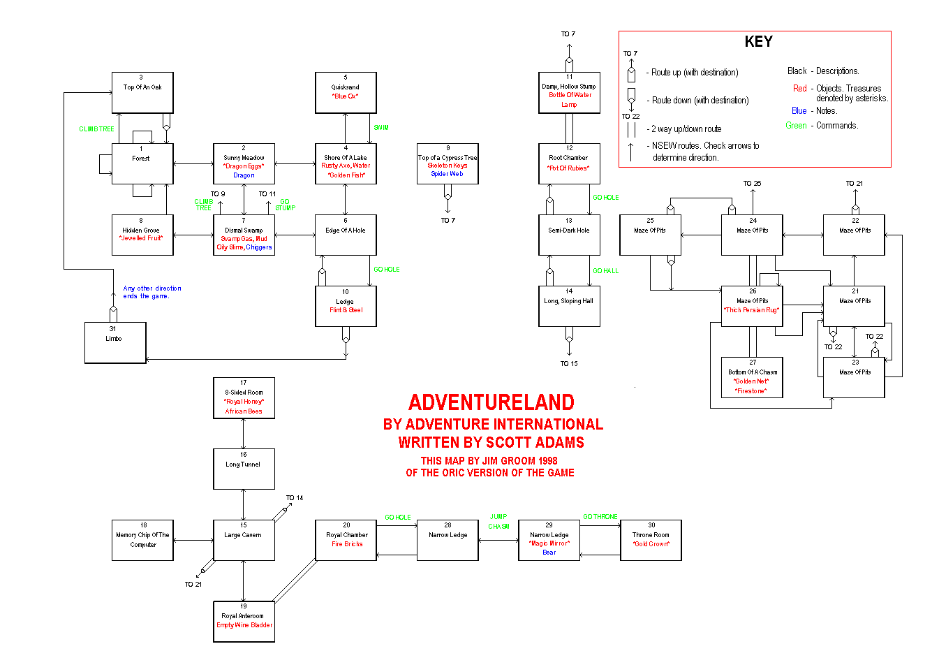 A Acheron's Rage by Softek To slow down the game, load the program, inhibit its auto-run and enter: DOKE#306,#950:CALL#900 Adventureland by Adventure International View the MAP. The complete solution is as follows: E, E, GET AXE, N, GET OX, SAY BUNYON, SWIM, S, GO HOLE, GET FLINT, U, W (At this location, you may get bitten by the chiggers, if so you will need to GET MUD), W, GET FRUIT, GET OX, GET AXE, E, CLIMB TREE, GET KEYS, D, CHOP TREE, DROP AXE, GO STUMP, DROP OX, DROP FRUIT, GET LAMP, D, GO HOLE, UNLOCK DOOR, DROP KEYS, GO HALL, LIGHT LAMP (if it ever runs out of fuel, you will need to FILL LAMP with the oily slime), D, S, GET BLADDER, N, U, U, UNLIGHT LAMP, U, GET RUBIES, U, DROP RUBIES, U, GET GAS, GO STUMP, GET BOTTLE, D, GO HOLE, GO HALL, LIGHT LAMP, D, S, U, DROP BLADDER, LIGHT GAS, GO HOLE, JUMP, YELL, GO THRONE, GET CROWN, W, GET MIRROR, JUMP, W, GET BRICKS, D, N, D, N, W, N, D, DAM LAVA, DROP BRICKS, POUR WATER, U, GET RUG, SAY AWAY (make sure the mud has dropped off!), S, GO STUMP, UNLIGHT LAMP, DROP RUG, DROP MIRROR, DROP CROWN, GET RUG, SAY AWAY, LIGHT LAMP, D, GET NET, GET FIRESTONE, U, SAY AWAY (again, make sure the mud has dropped off), E, UNLIGHT LAMP, DROP NET, S, W, GET MUD (you need the mud to survive the bees, if it falls off before you get them then you will need to go back for more), GO STUMP, DROP FIRESTONE, D, GO HOLE, GO HALL, LIGHT LAMP, D, N, N, GET HONEY, CATCH BEES (if the bees die, you'll have to go back for more), SAY AWAY, DROP MUD (if it hasn't already dropped off), SAY AWAY, RELEASE BEES, GET EGGS, S, (the bees may kill you here, so it may take several goes), GO STUMP, DROP HONEY, DROP RUG, DROP EGGS, UNLIGHT LAMP, RUB LAMP, RUB LAMP, DROP LAMP, U, E, N, GET NET, GET WATER, GET FISH (if they escape, you'll have to go back for more), S, W, GO STUMP, LEAVE FISH, LEAVE NET, SCORE. Ankhsenamon by Club Europe Oric Only some of the treasures need to be collected, these being indicated by the scrolls. To decode the scrolls you will need to work out the symbols used in writing which appears on the walls of some of the rooms. These change with each game. Arrow Of Death Part 2 by Channel 8 Software The complete solution: EXAMINE COURTYARD, EXAMINE MESSENGER, W, W, EXAMINE BED, TURN COAT, TURN COAT, TURN COAT, GO PASSAGE, GET SWORD, W, GET PILLOW, CUT PILLOW, DROP PILLOW, EXAMINE PURSE, GET COINS, GET ARMOUR, E, S, E, EXAMINE KITCHEN, GET HOOK, N, N, E, TIE ROPE (TO HOOK), GET ROPE, N, GIVE COINS, GET NOTE, READ NOTE, DROP NOTE, GET ORB, N, N, HOOK ARMOUR, GO LEDGE, PULL ROPE, DROP ROPE, GET ARMOUR, WEAR ARMOUR, RUB ORB, RUB ORB, GO CAVE, KILL SERPENT, KILL SERPENT, KILL SERPENT, GET ARROWHEAD, S, REMOVE ARMOUR, DROP ARMOUR, D, E, E, S, S, GET AMULET, N, E, WAIT, N, GIVE AMULET, WAIT, S, E, CUT CHAINS, S, S, U, MOVE BOULDER, GO CAVE, READ SCROLL, N, DROP ORB, D, N, GET TOADSTOOLS, E, N, GO COOKHOUSE, DRUG BROTH, N, GO BUILDING, CLIMB LADDER, GET LOG, W, GO FLUME, WAIT, GO BEACH, U, PLUCK FEATHERS, N, N, N, N, N, GO HUT, EXAMINE HUT, EXAMINE DWARF, GET SPECTACLES, S, N, W, N, EXAMINE DEBRIS, GO TRAPDOOR, OPEN CHEST, GET HOOK, WEAR SPECS, READ BOOK, DROP BOOK, U, S, E, S, GO HUT, GET MEDALLION, S, N, I, GO MARSH, E, N, THROW MEDALLION, CUT WILLOW. |